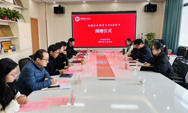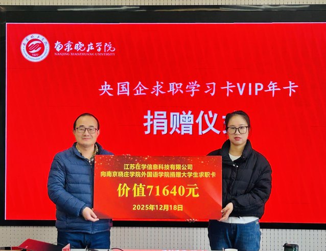 2025年12月25日,“央国企求职学习卡”捐赠仪式在南京晓庄学院方山校区崇一楼举行。江苏在学信息科技有限公司董事长陈大千、行政总监兼未来云校副总经理吕丹一行,南京晓庄学院教育发展基金会办公室副主任黄丹、外国语学院党委书记王静萍、副院长沈红伟、辅导员、毕业生代表共同参会,捐赠仪式由外国语学院党委副书记、副院长马晓亮主持。